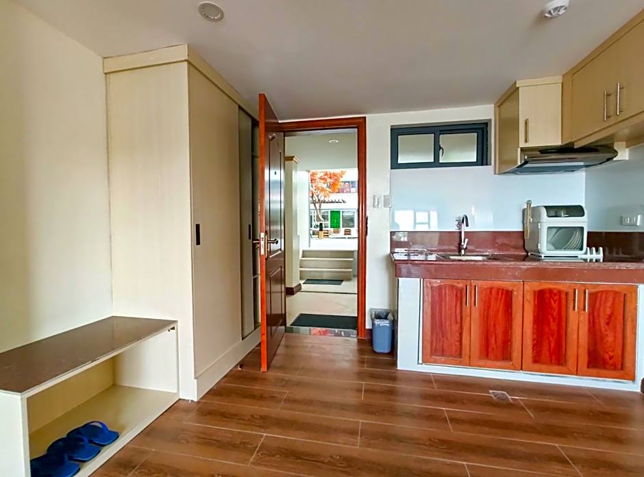 The fully equipped kitchen features a refrigerator, kitchenware and an electric kettle. The spacious studio offers a seating area, a dining area, a balcony with garden views as well as a private bathroom featuring a walk-in shower.